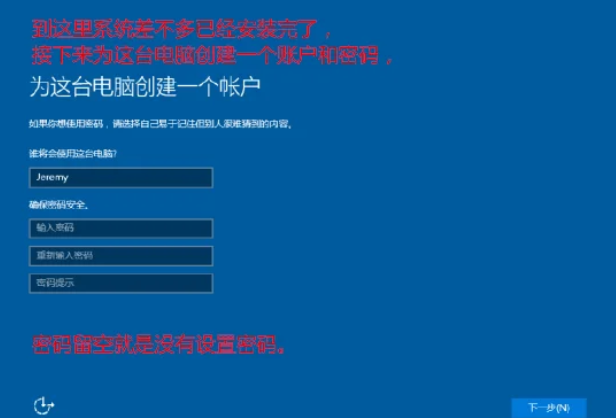 到这里系统差不多已经安装完了,为这台计算机创建一个账户和密码,密码留空就是没有设置密码